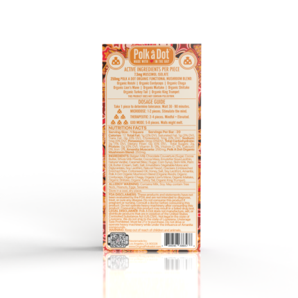 Experience the PolkaDot Blueberry Muffin Chocolate Bar. Vegan, gluten-free Belgian dark chocolate infused with 4 grams of psilocybin and blueberries. Enjoy rich flavor and cognitive benefits. Similar to this mushroom chocolate bar is the Polkadot Acai Mushroom Chocolate Bar, a vegan, gluten-free Belgian dark chocolate infused with blueberries and 4 grams of psilocybin.